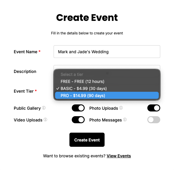 Select the tier that fits your event. Free tier gives you 12 hours and 1GB storage. Basic ($4.99) gives you 30 days and 20GB. Pro ($14.99) gives you 90 days and 200GB.